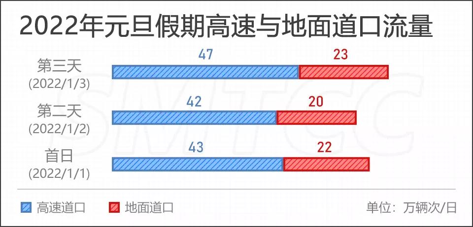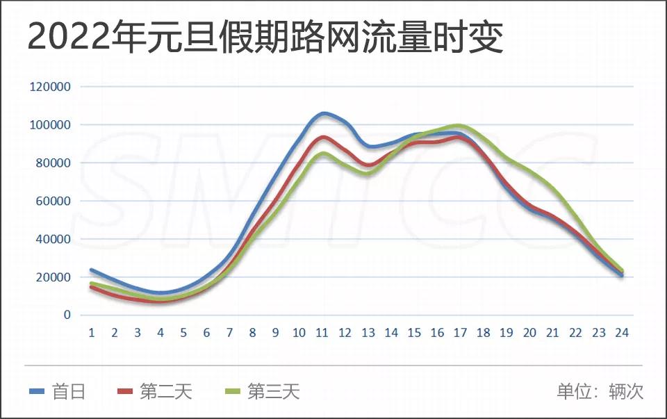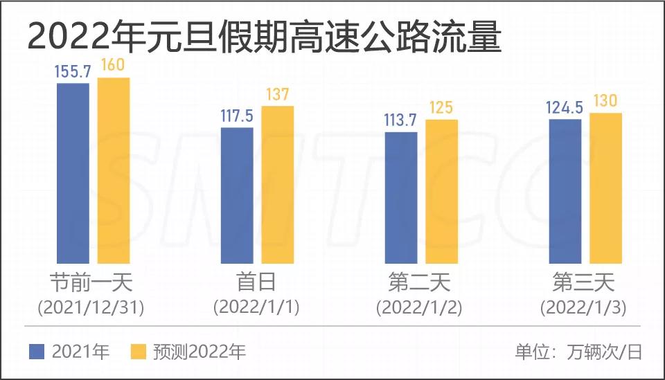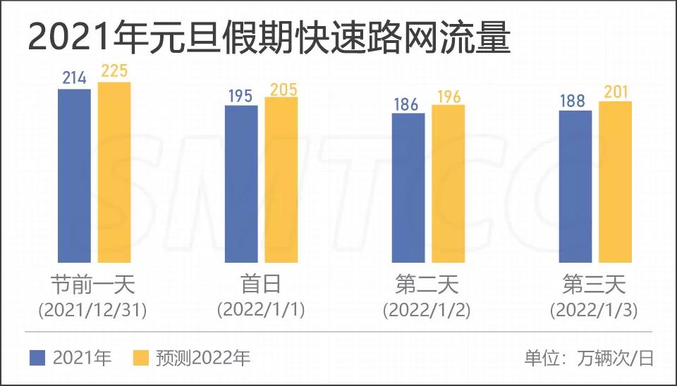 快速路方面,預計2022年元旦假期路網總體流量達603萬輛次,日均流量約201萬輛次,同比上升3.1%,與節前雙休日流量相比上升5個百分點。