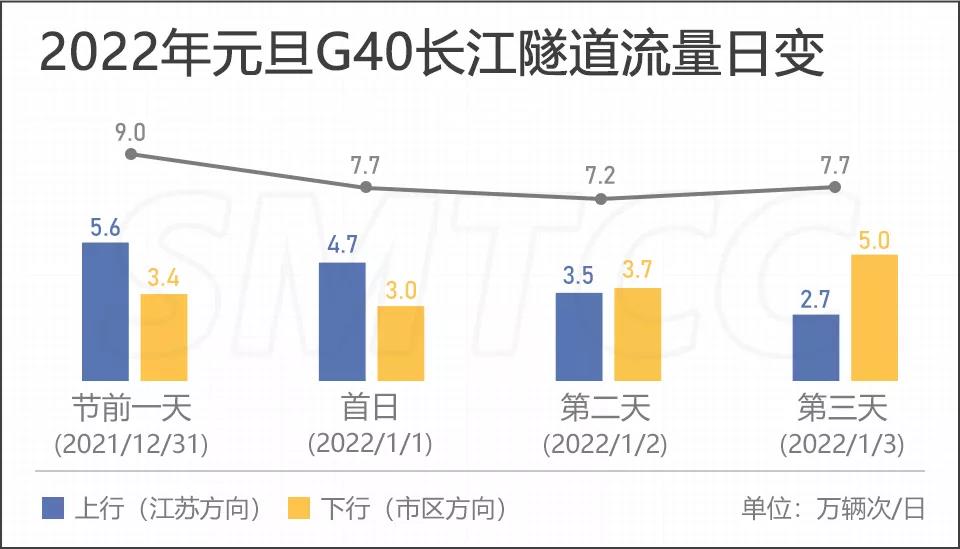 預計元旦期間,長江隧道日均流量約7.5萬輛次,同比增長10.3%。長江隧道流量方向性較為明顯,節前一天及假期首日,長江隧道流量以上行(江蘇方向)為主,其中節前一天高峯出現在下午15至20時,首日出行高峯出現在9時至12時,高峯小時流量達約5100輛次。節日最後一天,長江隧道流量以下行(市區方向)為主,高峯出現在下午14至18時,高峯小時流量達約5500輛次。