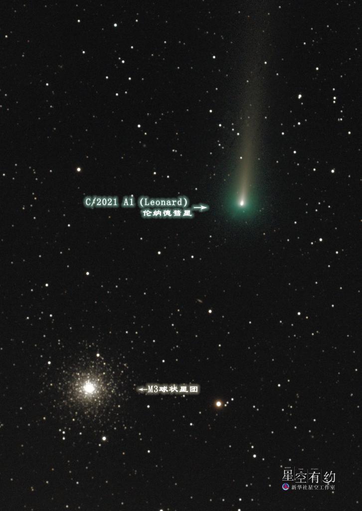 C/2021 A1彗星(即倫納德彗星)是2021年度“最亮彗星”。“該彗星將於2022年1月3日通過近日點,然後開始逐漸遠離太陽系中心的旅程,所以在地球上所觀測的亮度正持續減弱。不過這顆彗星在2021年12月20日突然迎來了二次爆發,亮度陡然增加,達到肉眼可見的程度,着實給眾多天文愛好者帶來了一次不小的驚喜。在飛向太陽的過程中,如果它沒有被太陽的強大引力扯碎進而‘香消玉殞’,預估2022年1月上旬的亮度在6等左右。在過近日點前的這幾日,在日落後的西南方低空,感興趣的公眾藉助望遠鏡可見它的影蹤。但隨着時間推移,它在日落時的位置會越來越低,可觀測時間也越來越短。”天津市天文學會理事、天文科普專家修立鵬説。