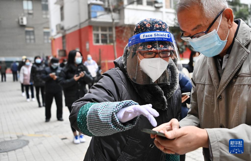 12月27日,志願者(前左)在陝西省西安市碑林區張家村街道太白社區核酸篩查現場協助居民出示健康碼。新華社記者 陶明 攝