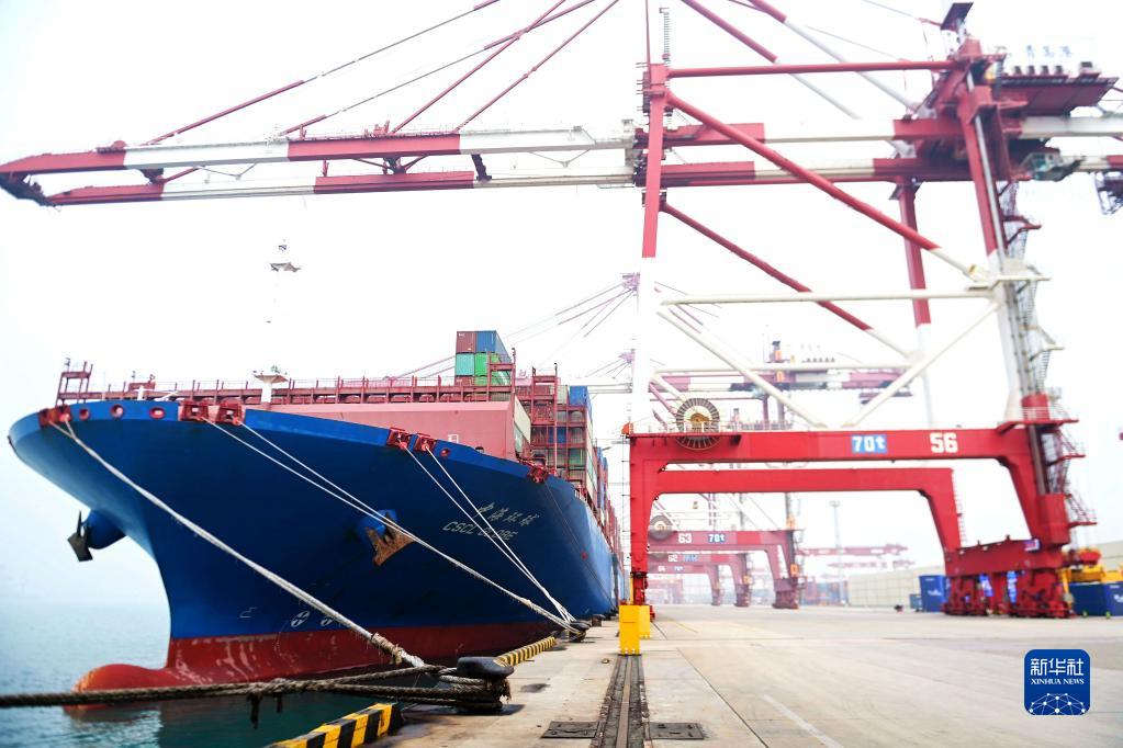 12月23日,在山東港口青島港前灣集裝箱碼頭,中海環球輪在等待裝載山東港口集團第3400萬標箱。新華社發(俞方平攝)