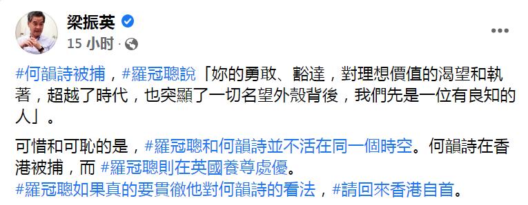 香港網媒“立場新聞”前董事何韻詩與其他6人因涉嫌觸犯“串謀發佈煽動刊物罪”,29日被香港警方拘捕。逃到英國的亂港分子羅冠聰29晚在臉書發文為何韻詩“打氣”讓她“撐住”,全國政協副主席、香港特區政府前行政長官梁振英隨後發文斥責羅冠聰“可恥”。他還喊話説:“羅冠聰如果真的要貫徹他對何韻詩的看法,請回來香港自首”。