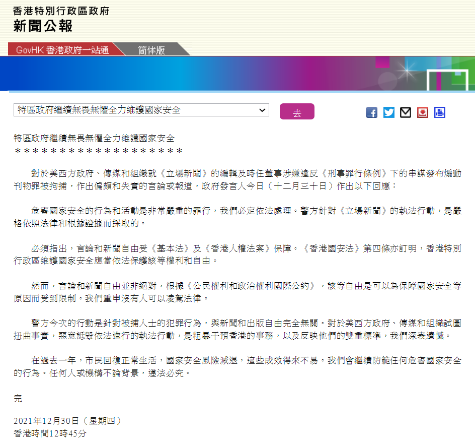 香港特別行政區政府發言人表示,危害國家安全的行為和活動是非常嚴重的罪行,我們必定依法處理。警方針對“立場新聞”的執法行動,是嚴格依照法律和根據證據而採取的。