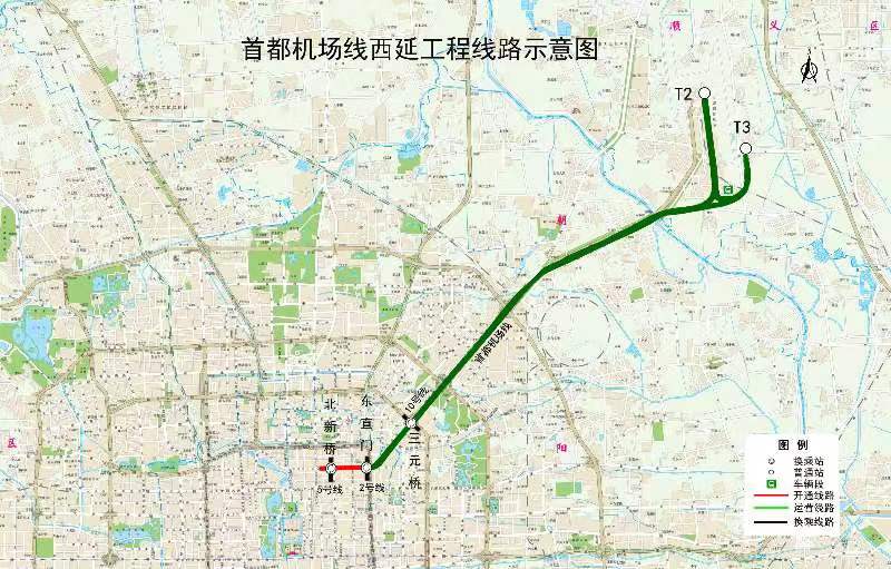 機場線西延全長約1.8公里,從東直門站西延至北新橋站。開通後將實現首都機場線與5號線的換乘,換乘距離僅30米,換乘時間只需1分鐘,非常方便快捷。機場線西延建成以後,將大大疏解東直門站客流壓力,提升首都機場線整體系統運營能力,同時有效加強首都機場線與城市軌道交通線網聯繫,擴大首都機場線的服務範圍。