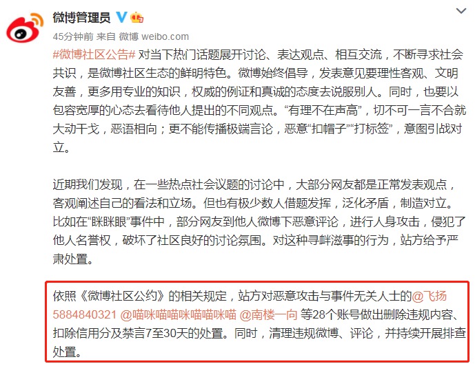依照《微博社區公約》的相關規定,站方對惡意攻擊與事件無關人士的@飛揚5884840321 @喵咪喵喵咪喵喵咪喵 @南樓一向 等28個賬號做出刪除違規內容、扣除信用分及禁言7至30天的處置。同時,清理違規微博、評論,並持續開展排查處置。