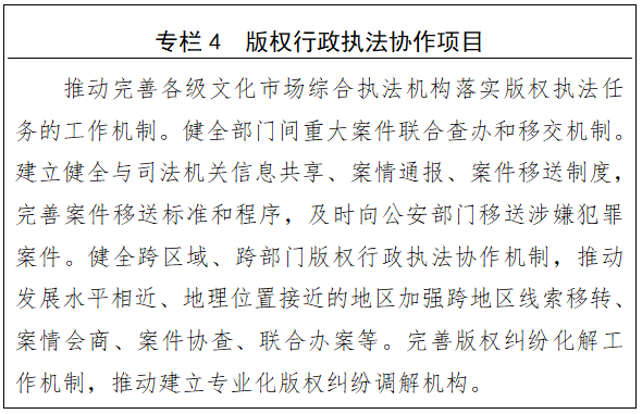 3. 加強版權執法協作。進一步加強對文化市場綜合執法機構的指導,有效發揮文化市場綜合執法機構的版權執法職能。加強與工信、公安、海關、市場監管、網信等部門的執法協作。鞏固加強兩法銜接機制,進一步推動版權行政執法與刑事司法的有效銜接。在案件多發地區探索建立仲裁、調解優先推薦機制。建立健全版權案件分流制度,推進案件繁簡分流機制改革。充分發揮全國打擊侵權假冒領域行政執法與刑事司法銜接工作信息共享平台和國家版權監管平台的作用,加強數據管理和有效應用,提高銜接工作效率和規範化水平。