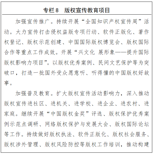 5. 加強版權宣傳引導。把貫徹落實黨中央、國務院的戰略決策部署作為版權宣傳工作的着眼點,建設常態化、立體化和精準化的版權宣傳機制。綜合運用多種媒體形態,不斷提升版權宣傳的生動性和有效性,及時準確回應社會關注、產業關切、羣眾關心的版權熱點焦點問題,營造尊重版權的良好文化氛圍,提高全社會版權意識。強化版權涉外宣傳工作,進一步提升版權國際傳播力,以塑造良好形象、維護國家利益、傳播中華優秀傳統文化為主要任務,把握大勢、區分對象、精準施策,助力提高國家文化軟實力和中華文化影響力。通過國家版權局英文網站、版權重點事件、多雙邊交流場合等開展日常對外宣傳,主動發聲,增信釋疑。繼續與世界知識產權組織開展版權保護優秀案例示範點調研項目,並通過世界知識產權組織等國際多邊平台貢獻中國智慧和中國方案。