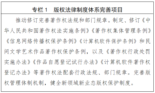 1. 健全版權法律法規和政策制度。開展基礎性版權法律制度和政策研究,制定、修訂版權行政執法、著作權集體管理組織監管、作品登記、馬拉喀什條約實施等有關著作權行政法規、部門規章和規範性文件。加強對地方著作權立法工作的指導和支持,鼓勵各地區在立法權限範圍內因地制宜制定地方性法規和規章,保障各項著作權法律法規在各地區有效實施。