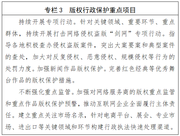 1. 全面加強版權保護。將全面加強版權保護作為版權執法監管工作的主要基調和基本導向,利用版權手段加強意識形態管理,充分發揮行政執法優勢,加大行政執法力度,對羣眾反映強烈、社會輿論關注、侵權盜版多發的重點領域和區域堅決持續整治。貫徹中央“放、管、服”決策部署,強化事中事後監管,形成事前預防、事中監管和事後嚴懲的全面監管機制。加強版權行政執法指導制度建設,不斷提升版權執法效能,加大案件查辦力度,提高案件辦理質量。完善版權快速維權與維權援助機制,縮短侵權事件處理週期。