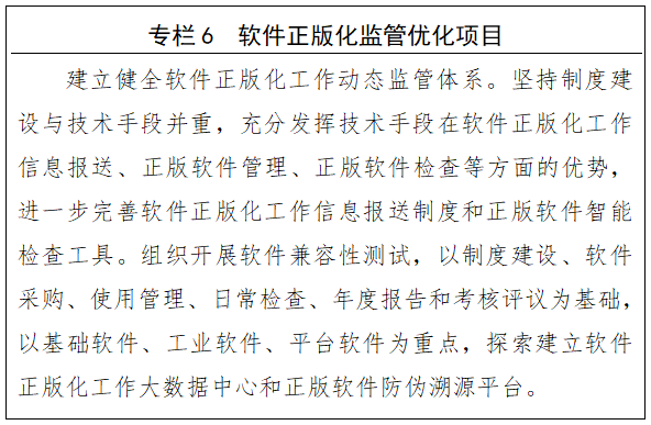 4. 大力推進軟件正版化工作與信息安全工作結合。結合網絡強國建設和軟件產業高質量發展政策要求,堅持軟件正版化工作與信息化建設、信息安全工作緊密結合,相互支持、相互促進。推動各地區各部門部署建設的信息系統同步實現軟件正版化,併兼容國產基礎軟件、國產工業軟件、國產平台軟件等國產軟件,防範在信息化建設過程中“重硬輕軟”,強化網絡信息安全保障,助推軟件產業高質量發展。