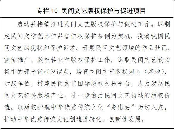 3. 推動民間文藝版權保護國內立法實踐和國際推廣聯動。堅持文化自信,依託國內豐富的多民族和民間文藝資源,堅持交流互鑑、開放包容、以我為主、為我所用的原則,推動完善民間文藝版權保護國內立法,着力解決我國在傳統文化表現形式的傳承、利用、保護和弘揚等方面存在的版權問題,大力發展民間文藝相關版權產業。積極推動國際民間文藝版權對話交流,以國內立法和實踐經驗為基礎,深度參與相關國際規則制定,貢獻中國經驗和中國智慧。