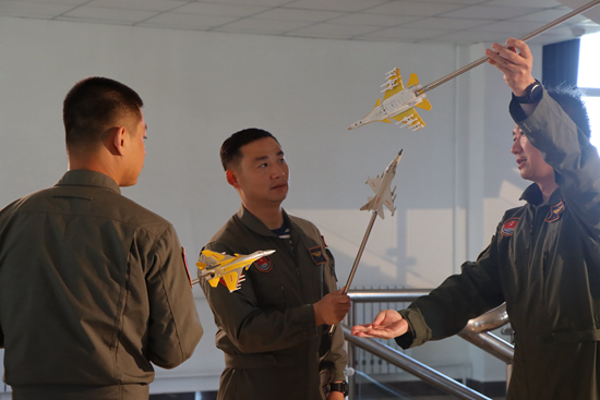 海軍航空大學某基地組織地面演練,飛行教官丁陽(右一)用飛機模型教授學員戰術動作。趙天淏/攝