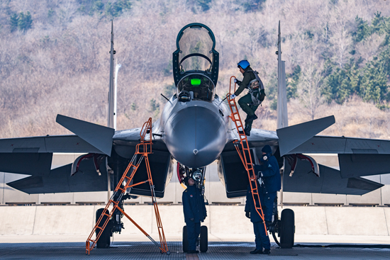 海軍航空大學某基地組織晝間飛行訓練,飛行教官在機務人員的幫助下登上殲-15戰鬥機。萬全/攝