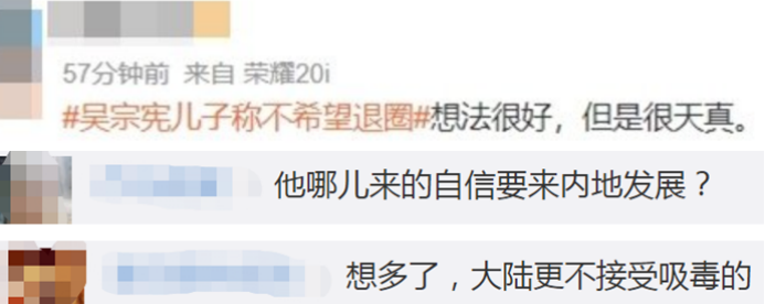對於吳宗憲透露兒子在前往大陸發展,有大陸網友諷刺道:“想法很好,但是很天真”、“他哪來的自信要來大陸發展?”↓