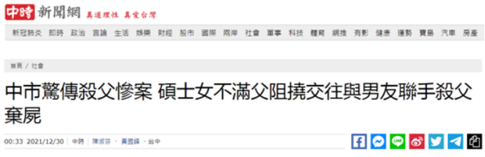 台媒:台中一女子不滿父親阻撓其與男友交往,竟與男友合謀殺父棄屍