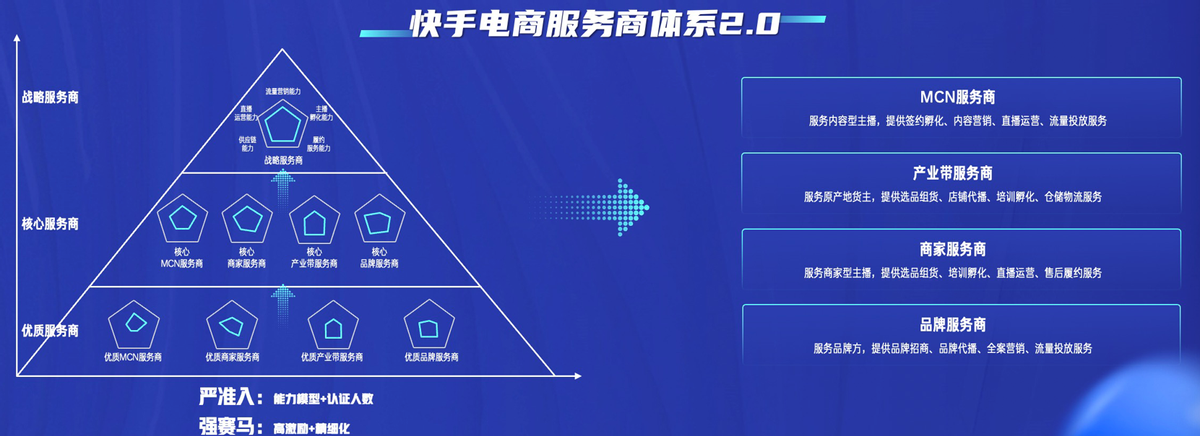 會上,李叢杉正式發佈“快手電商服務商生態體系2.0”,在優質、核心、戰略這三個以實力劃分服務商的基礎上,還按服務商擅長的領域將其分為MCN服務商、產業帶服務商、商家服務商和品牌服務商。