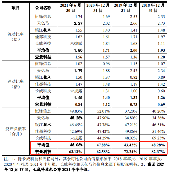 報告期各期末,宏景科技資產負債率分別為82.37%、72.24%、62.58%和63.13%,雖然公司資產負債率呈下降趨勢,但仍處於較高水平。對比同行業可比公司,宏景科技資產負債率遠高於行業平均水平。