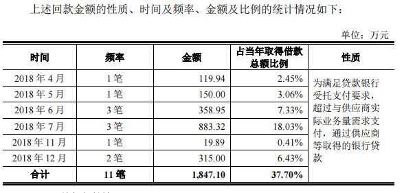 對於上述情況,宏景科技表示,“因公司向供應商採購原材料的規格及採購次數較多,故通常分批次支付採購款。由於銀行貸款的受託支付通常以單筆大額資金支付為主,從而與公司實際流動資金支付需求的多批次存在差異。為解決上述矛盾,公司通過供應商轉貸,集中取得流動資金貸款後,再分批逐步支付流動資金”。