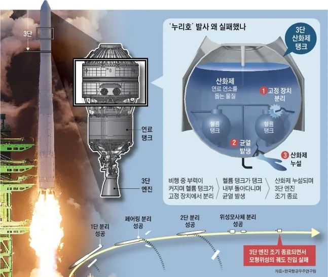 初步調查認為,“Nuri”號試射失敗的原因是三級火箭發動機比原計劃提前結束燃燒。但這次專家們發現,火箭發動機提前關機,是因為三級火箭的氧化劑罐內的氦氣罐固定裝置鬆動,後者在飛行過程中到處亂撞,導致罐體內部出現裂縫,最終出現氧化劑泄漏。