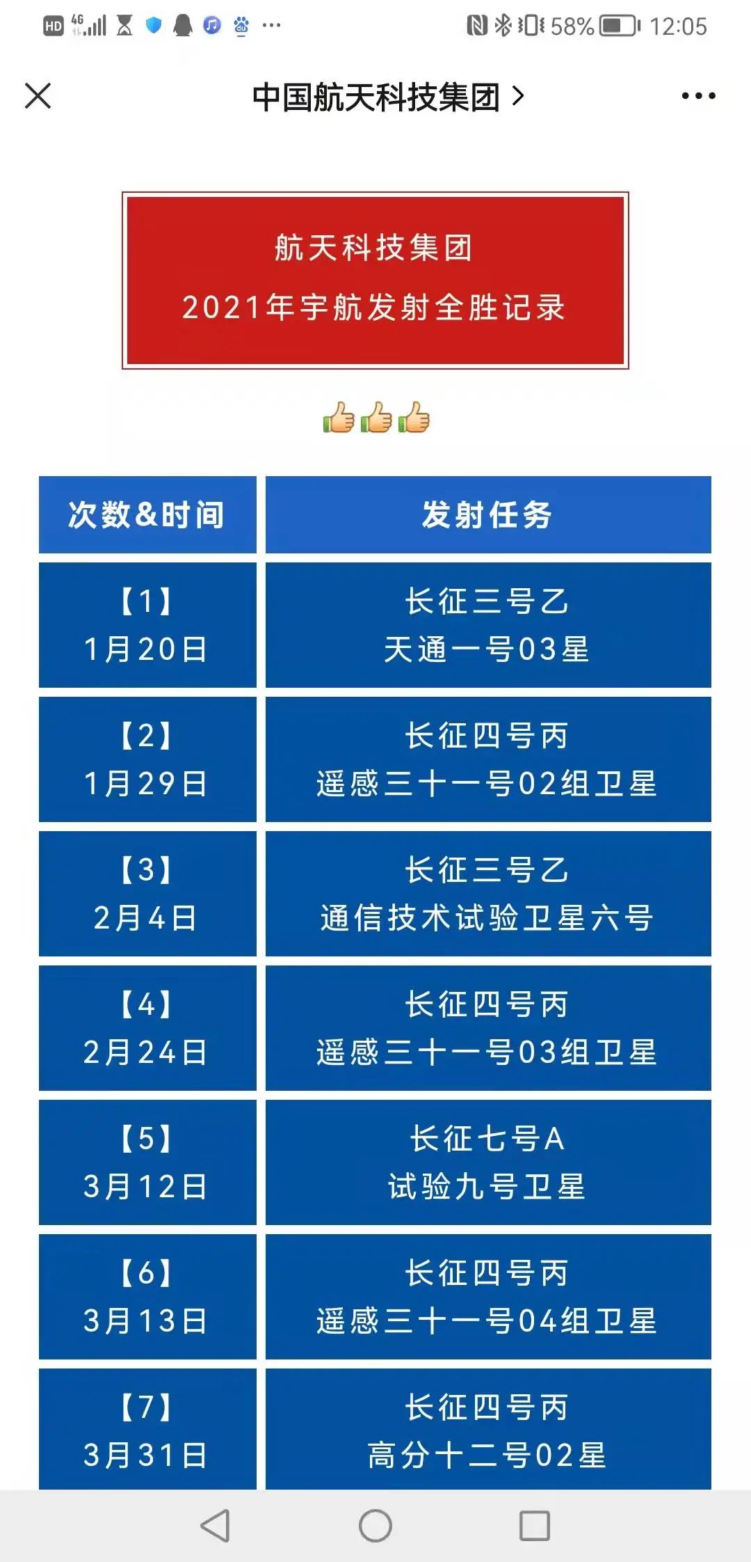 55次發射是個什麼概念呢?這麼説吧,平均不到7天就有一次發射,這一點從中國航天2021的發射起止時間也可以看出。2021年,中國的首次航天發射是1月20日長征三號乙將天通一號03星送入預定軌道,第55次航天發射是12月30日凌晨長征三號乙將通信技術試驗衞星九號送入預定軌道。