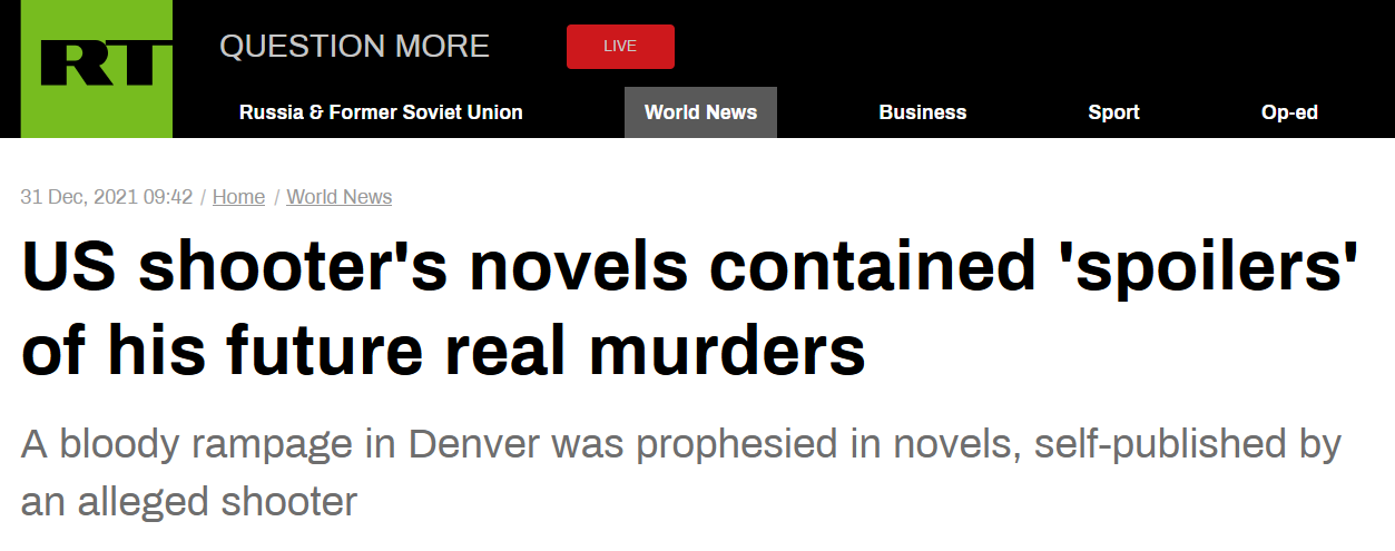 【環球網報道 記者 趙建東】“美國槍手的小説‘劇透了’未來真實謀殺案”,今日俄羅斯(RT)31日以此為題報道,當地時間12月27日,美國丹佛一名男子被控殺害五人,細思極恐的是該男子所寫的《制裁》三部曲小説均“預演”了這些謀殺案。