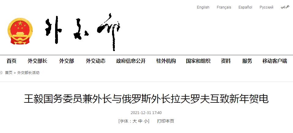 在2022年新年來臨之際,國務委員兼外長王毅與俄羅斯外長拉夫羅夫互致新年賀電。