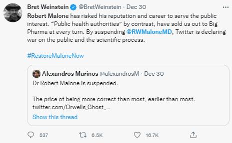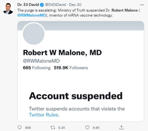 有網友諷刺推特是“真理部”:“清洗正在升級:‘真理部’封了羅伯特·馬龍博士(的賬號),(就是那位)mRNA疫苗技術發明者。”↓