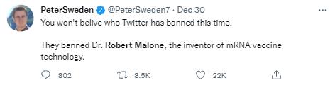 有網友稱推特這一舉動“難以置信”:“你不會相信推特這次封了誰。他們封了羅伯特·馬龍博士、mRNA疫苗技術發明者(的賬號)。”↓
