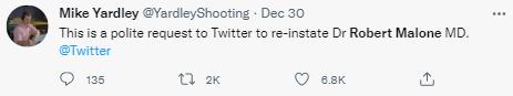 有網友@推特官方,要求恢復馬龍的賬號:“這是一個禮貌的請求,(請求)推特恢復羅伯特·馬龍博士(的賬號)。”↓