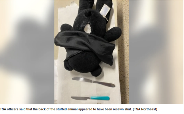 美國運輸安全管理局(TSA)發言人麗莎·法布斯坦(Lisa Farbstein)在推特上證實,一名女子在費城國際機場接受安檢時被發現攜帶兩把刀,它們被藏在一個毛絨玩具熊裏。