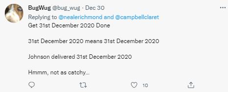 還有網友試着按英國政府這一建議進行表達,認為並不那麼合適:“在2020年12月31日完成。約翰遜發佈了2020年12月31日(的一份聲明)。呃呃,不是那麼合適…”↓