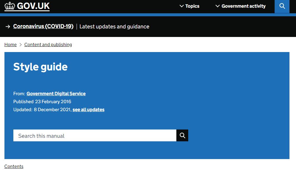 英國政府官網顯示,在該網站專門為“政府數字出版和服務”的指導界面上,就可看到這一發佈於2016年2月、本月8日最新更新的“風格指南”。官網介紹稱,該“風格指南”為英國政府官方發佈的一切內容提供了包括語言風格、拼寫、語法用法建議,並以英文字母“A至Z”進行了排序。