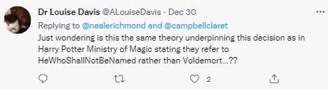 有網友聯想到英國魔幻文學系列小説《哈利·波特》中不能被提名字的“伏地魔”:“就是想問下,這和《哈利·波特》裏魔法部決定將‘伏地魔’叫做‘那個連名字都不能提的人’一個道理嗎?”↓