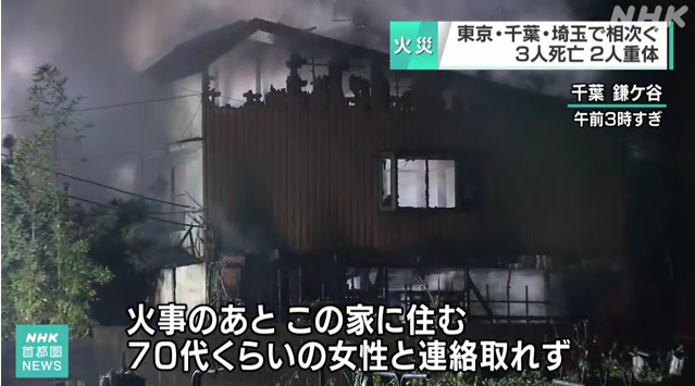 31日凌晨1點,千葉縣鐮谷市有路人報火警稱“看到有建築燃燒,火勢就快轉移到旁邊的房子上了”。7輛消防車趕赴現場,火勢在3小時後基本撲滅。據悉,包括住宅樓在內,共5棟房子接連起火,其中3棟全部燒燬。最初起火的也是一棟二層木質住宅樓,廢墟中發現一人遺體。警方稱,住在這裏的是一名70餘歲老者,已失聯,目前正確認死者身份。與其相鄰住宅的居民都已逃生。