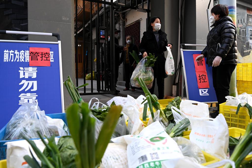 12月29日,在西安市新城區西一路街道通濟南坊一號院,居民在領取免費生活物資。新華社記者 劉瀟 攝
