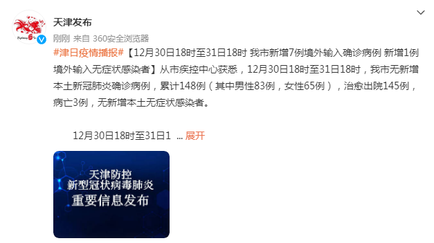第435例境外輸入確診病例,中國籍,近期居住地為古巴。該患者自古巴至法國巴黎轉乘航班(CA934),於12月30日抵達天津濱海國際機場,入境時體温正常,申報無異常。經海關檢疫排查採樣後,轉送至和平區集中隔離醫學觀察點。今日新冠病毒核酸檢測結果為陽性,即由120救護車轉送至海河醫院治療。經市級專家組綜合分析確定為我市境外輸入新冠肺炎確診病例(輕型)。全程實施閉環管理。