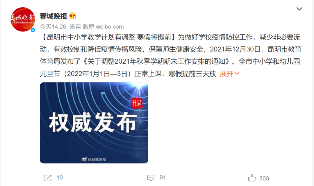 為做好學校疫情防控工作,減少非必要流動,有效控制和降低疫情傳播風險,保障師生健康安全,昆明市教育體育局發佈了《關於調整2021年秋季學期期末工作安排的通知》。