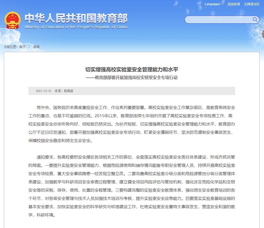 據教育部網站12月31日消息,教育部辦公廳發佈關於開展加強高校實驗室安全專項行動的通知。通知全文如下: