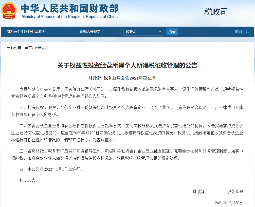 12月30日,財政部等兩部門發佈關於權益性投資經營所得個人所得税徵收管理的公告。內容如下: