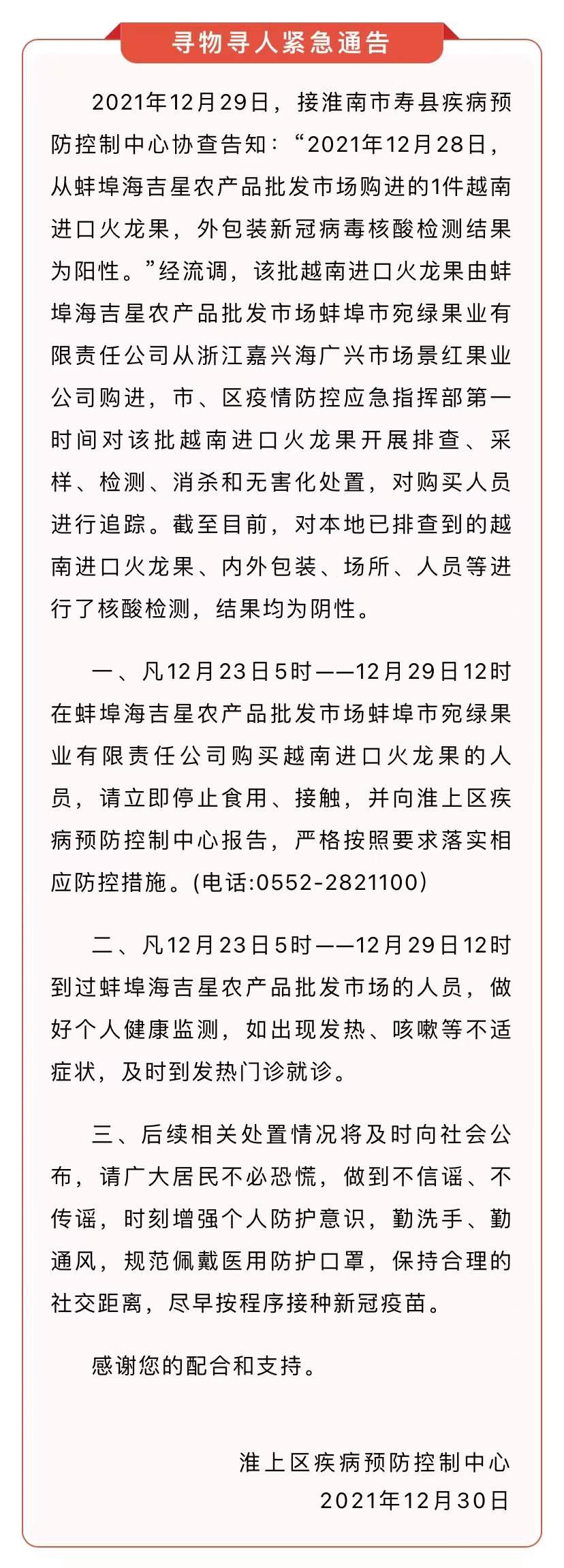 12月30日,安徽省蚌埠市淮上區疾病預防控制中心發佈尋物尋人緊急通告稱,2021年12月29日,接淮南市壽縣疾病預防控制中心協查告知:“2021年12月28日,從蚌埠海吉星農產品批發市場購進的1件越南進口火龍果,外包裝新冠病毒核酸檢測結果為陽性。”經流調,該批越南進口火龍果由蚌埠海吉星農產品批發市場蚌埠市宛綠果業有限責任公司從浙江嘉興海廣興市場景紅果業公司購進,蚌埠市、淮上區疫情防控應急指揮部第一時間對該批越南進口火龍果開展排查、採樣、檢測、消殺和無害化處置,對購買人員進行追蹤。截至目前,對本地已排查到的越南進口火龍果、內外包裝、場所、人員等進行了核酸檢測,結果均為陰性。