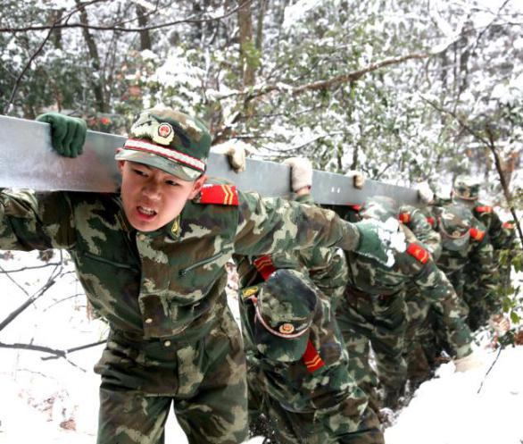 2008年1月,全國21個省遭受嚴重雨雪冰凍災害。武警部隊投入6萬餘名兵力抗擊雨雪冰凍災害。圖為着07式迷彩服的武警戰士