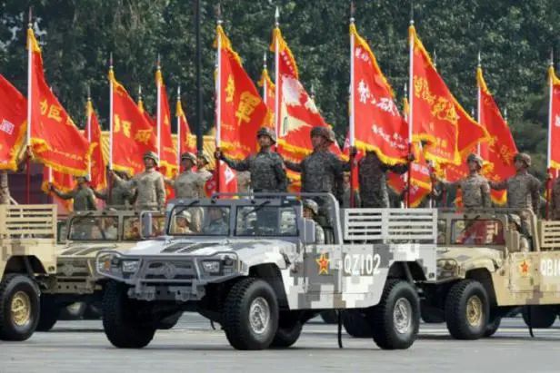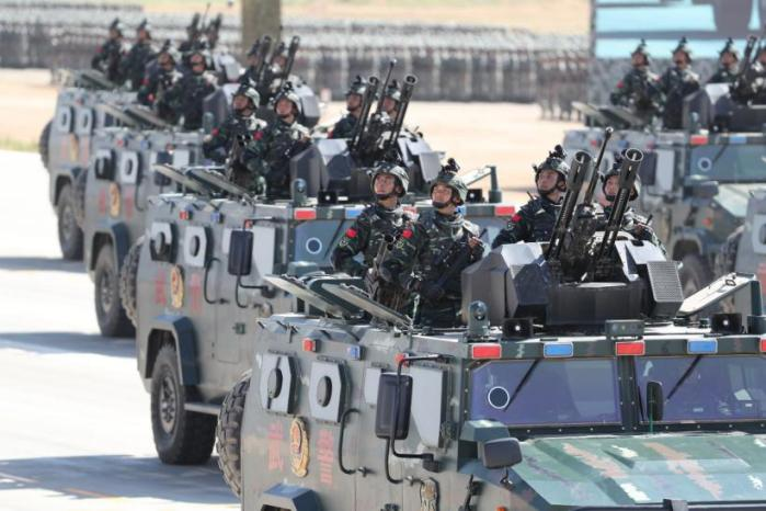 2019年,在慶祝中華人民共和國成立70週年閲兵式上,緊跟在徒步方隊之後的32個裝備方隊,不管是將軍領隊還是普通士兵,全部穿新式迷彩作訓服。行駛在裝備方隊最前面的是戰旗方隊。在五大戰區指揮員引領下,載着100面榮譽戰旗的“猛士”車緩緩駛過天安門前。五大戰區領導:三位上將、兩位中將,分別穿着五種迷彩作訓服,連他們乘坐的指揮車也噴成這五種迷彩。