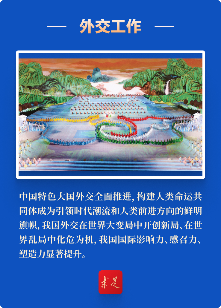 “經過持續努力,中國特色大國外交全面推進,構建人類命運共同體成為引領時代潮流和人類前進方向的鮮明旗幟,我國外交在世界大變局中開創新局、在世界亂局中化危為機,我國國際影響力、感召力、塑造力顯著提升。”