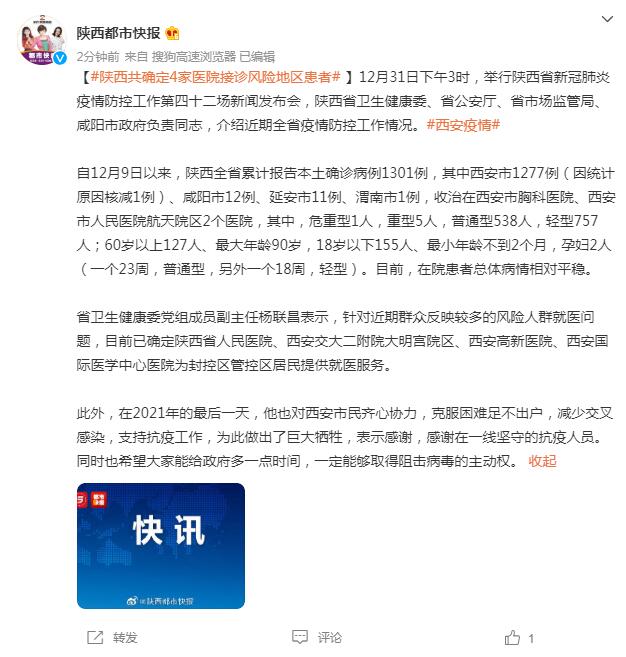【#陝西共確定4家醫院接診風險地區患者# 】12月31日下午3時,舉行陝西省新冠肺炎疫情防控工作第四十二場新聞發佈會,陝西省衞生健康委、省公安廳、省市場監管局、咸陽市政府負責同志,介紹近期全省疫情防控工作情況。#西安疫情#