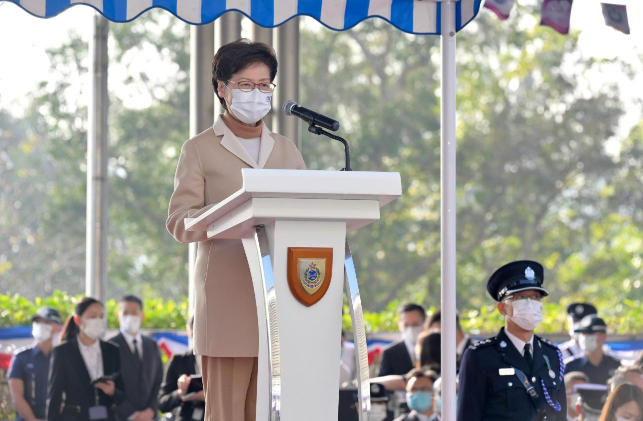 林鄭月娥勉勵結業學員,希望他們堅守初心,牢記使命,迎難而上,盡心盡力服務香港和報效祖國。(總枱記者 葉麗麗 周偉琪)