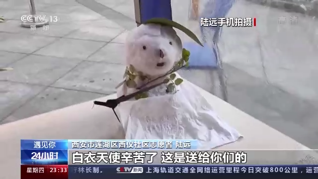 *西安市蓮湖區西儀社區志願者 陸遠:*這是居民小朋友堆的一個小雪人,當時覺得特別暖心,還有一段文字“白衣天使辛苦了,這是送給你們的”。