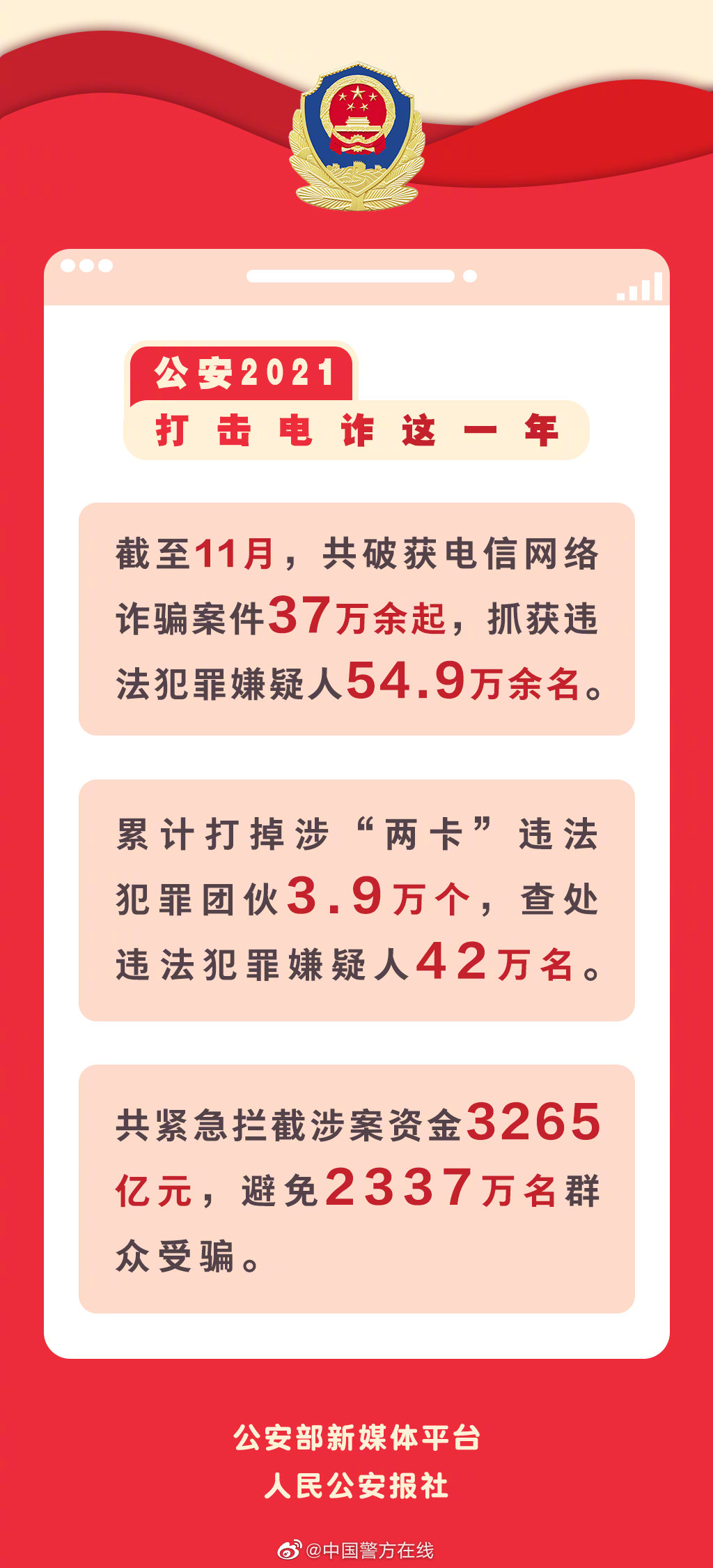 2021年,全國公安機關深入學習貫徹習近平總書記重要指示精神,縱深推進打擊治理電信網絡新型違法犯罪工作,電信網絡詐騙犯罪發案數連續下降,取得顯著成效。