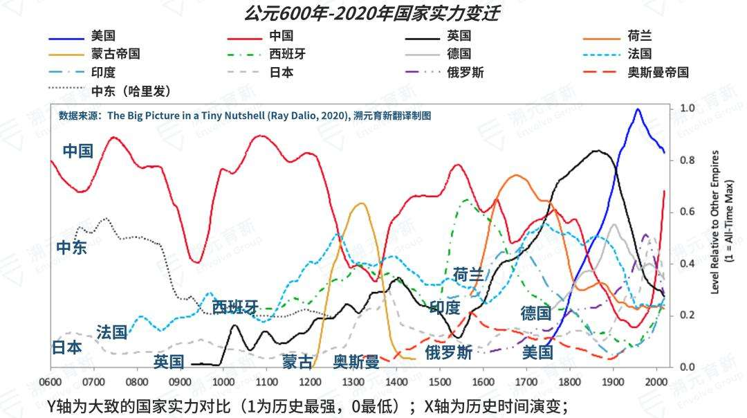 國際政治大格局的變革集中體現為國家實力的消長。十七世紀前,多數時間中國的國家實力處於國際前列。十七到十九世紀,歐洲荷蘭、英國相繼成為世界強國,直至二十世紀被美國超越。