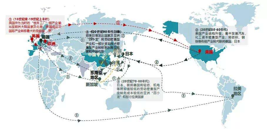 而國家綜合實力的基礎就是經濟實力,而經濟實力的基礎則是工業實力。歷史上,全球範圍內曾出現過四次大規模的產業轉移,每一次產業轉移都伴隨着全球財富的重新分配。第一次轉移成就了美國,第二次轉移成就了德日,第三次轉移成就了“亞洲四小龍”,第四次轉移成就了中國。