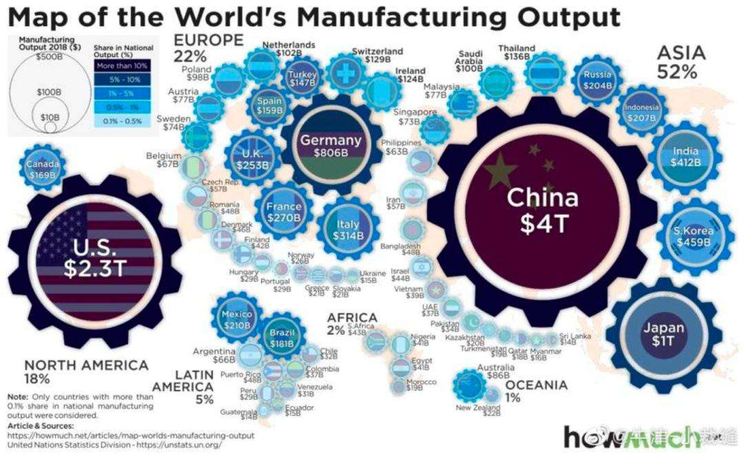 而上世紀80年代以來,中國積極擁抱全球化浪潮,承接全球第四次產業轉移,國家建設取得的偉大成就舉世矚目。目前,中國擁有世界上規模最大的製造業,行業齊全的工業體系。聯合國統計資料顯示,中國製造業佔全球製造業產值的比重已超過25%,在全球500種主要工業產品中,中國有220多種產量位居世界第一。在發展的廣度方面,中國擁有39個工業大類,191箇中類和525個小類,是當今世界唯一擁有聯合國產業分類中全部工業門類的國家。